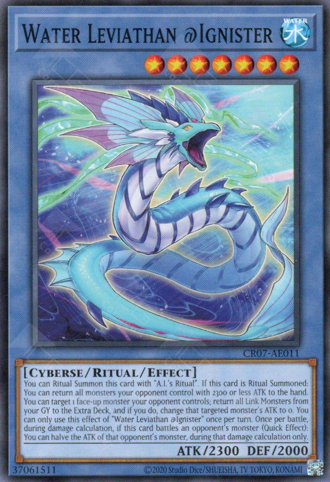 You can Ritual Summon this card with " A.I.'s Ritual ". If this card is Ritual Summoned: You can return all monsters your opponent control with 2300 or less ATK to the hand . You can target 1 face-up monster your opponent controls; return all Link Monsters from your GY to the Extra Deck , and if you do, change that targeted monster's ATK to 0. You can only use this effect of "Water Leviathan @Ignister" once per turn . Once per battle , during damage calculation , if this card battles an opponent's monster ( Quick Effect ): You can halve the ATK of that opponent's monster, during that damage calculation only.