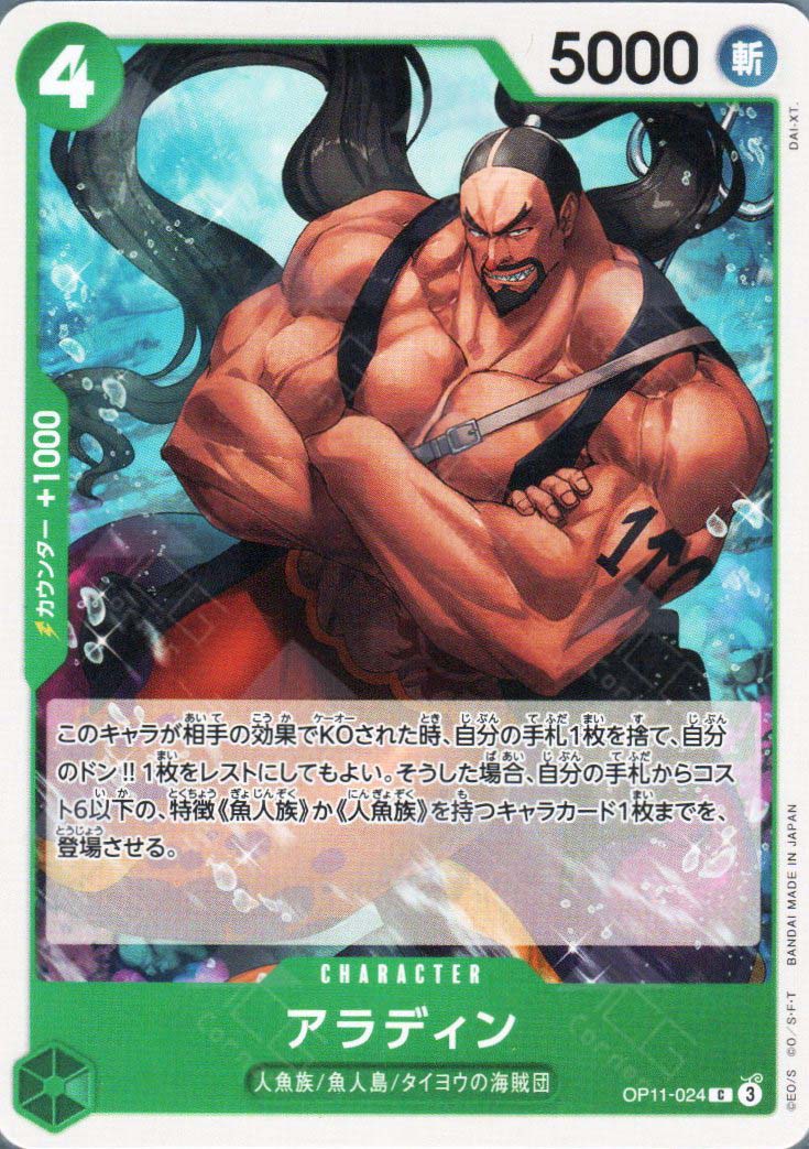 Effect: When this Character is K.O.'d by your opponent's effect, you may trash 1 card from your hand and rest 1 of your DON!! cards. If you do, play up to 1 {Fish-Man} or {Merfolk} type Character card with a cost of 6 or less from your hand.